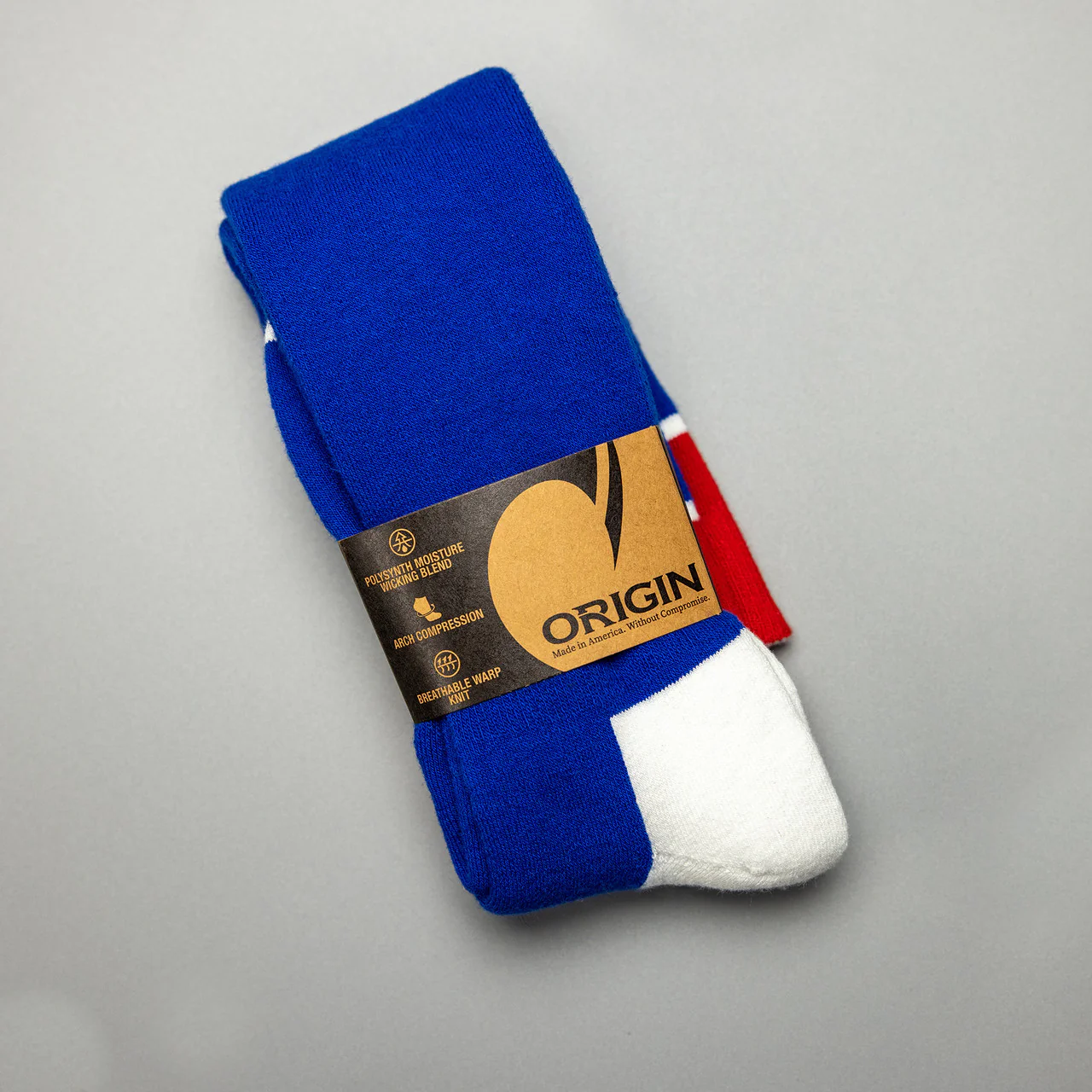 Origin's Anthem Knee-High Socks are 100% Made in America, and feature a Polysynth Moisture Wicking Blend, Arch Compression, and Breathable Warp Knit.